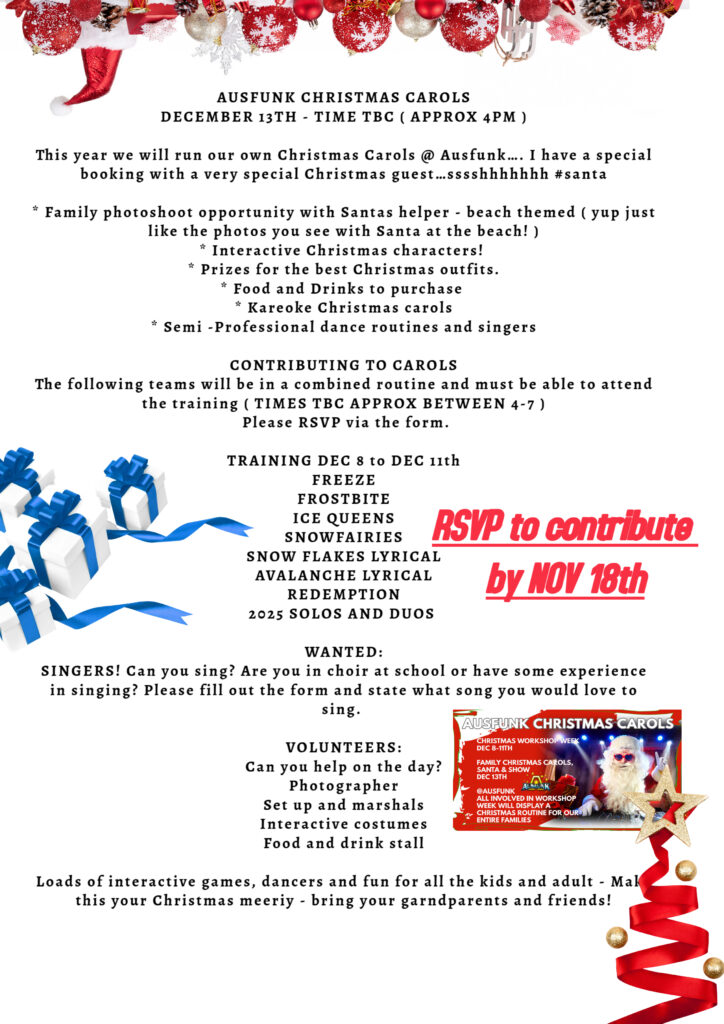 RSVP Carols participation DEC 8-11th and Carols DEC 13th RSVP by Nov 19th – https://www.cognitoforms.com/AusfunkCheerDance/AusfunkChristmasCarols