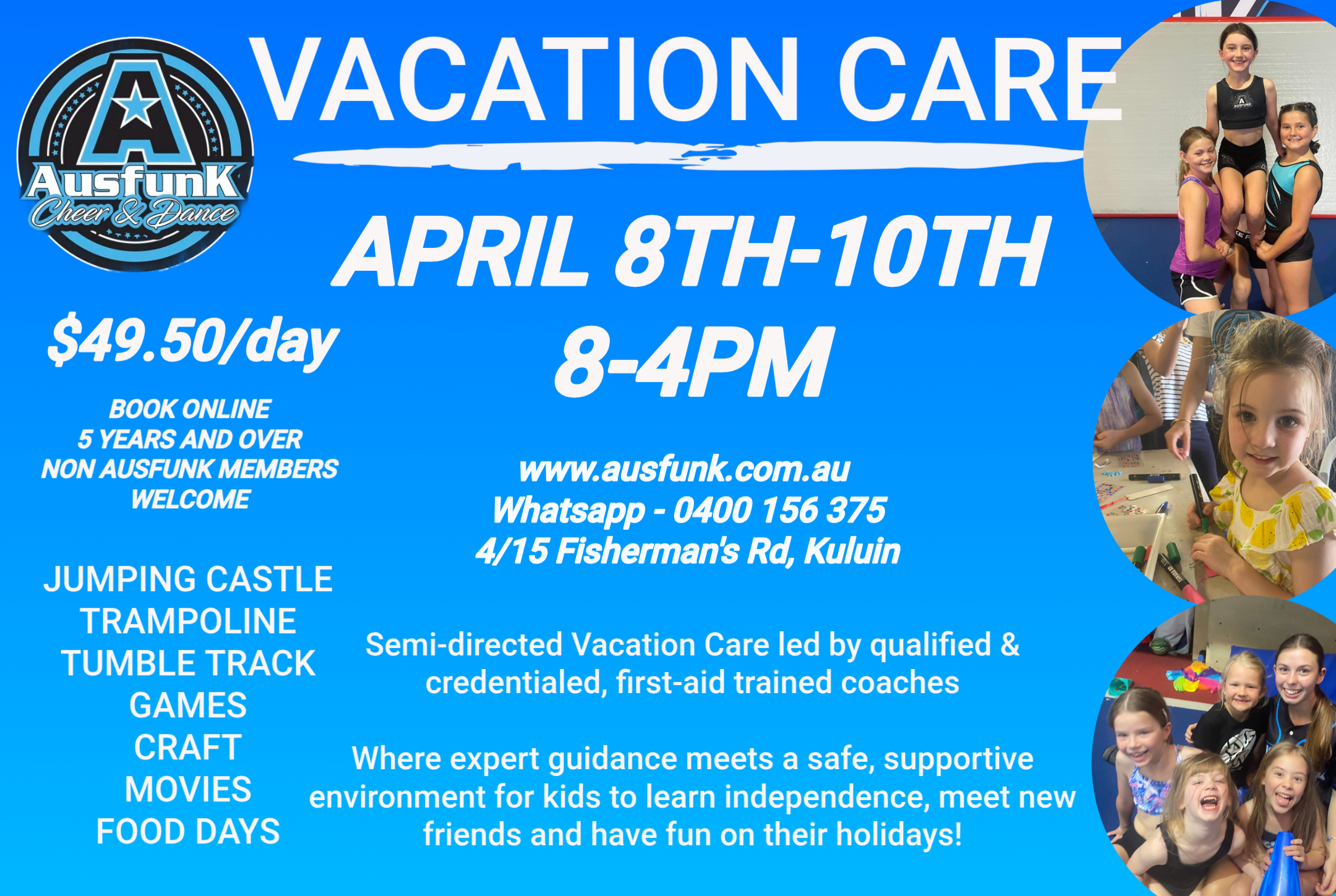 Ausfunk Cheer & Dance - Kuluin 4/13-15 Fishermans Rd, KuluinEach day has a FOOD theme: Mondays - Iceblocks Tuesdays - Hotdogs Wednesdays - Flav Milk & Biscuits Thursdays - Cheese Pizza Fridays - Party Food PLUS Craft Jumping Castle Games Trampoline Games Tumble Track Make new friends! Week 1: 15 - 19 Dec - $44/ day or $180 for 5 days (Including GST) […]