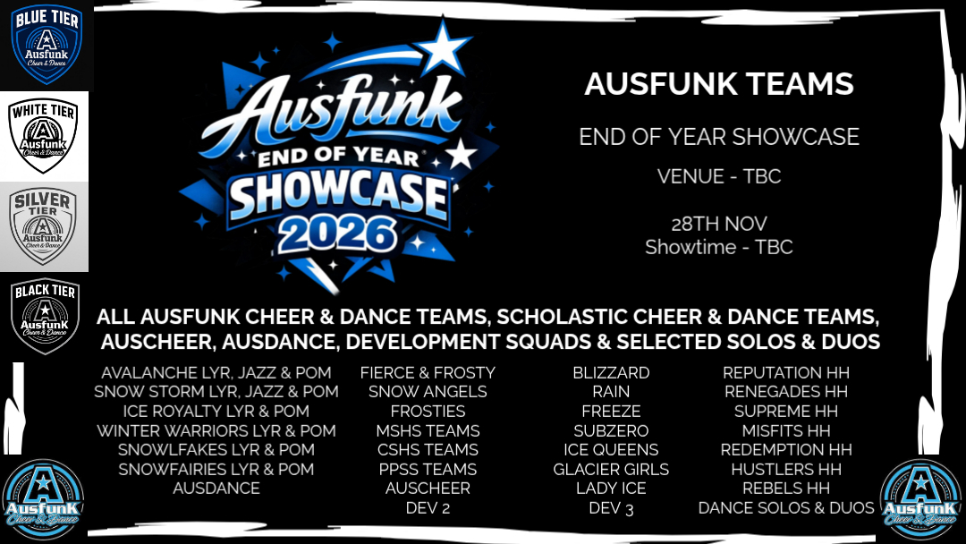 Ausfunk Cheer & Dance - Kuluin 4/13-15 Fishermans Rd, KuluinOnly 10 Spots available per class $25 per session (plus booking fee) Thursday 8th and 15th January 2026 Level 1: 4:15 - 5pm Level 2: 5 - 5:45pm Level 3-5: 5:45 - 6:45pm BOOK HERE